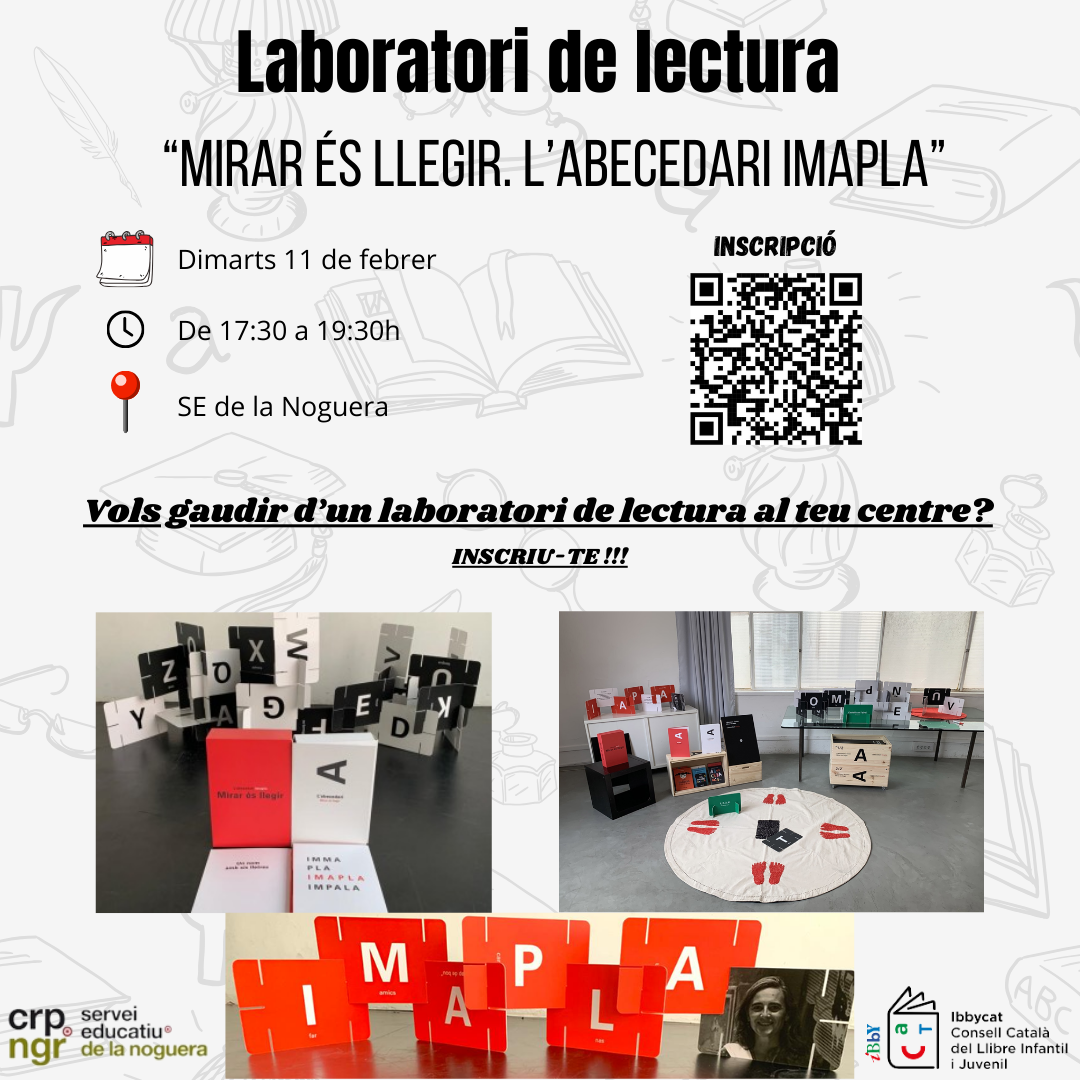 Aquesta sessió estarà oberta a tots els docents de La Noguera. Durant aquesta sessió, es presentarà el laboratori “Mirar és llegir: Abecedari Imapla”, un joc creat a partir de les lletres de l’abecedari. Es presentaran activitats i dinàmiques per treballar als centres.