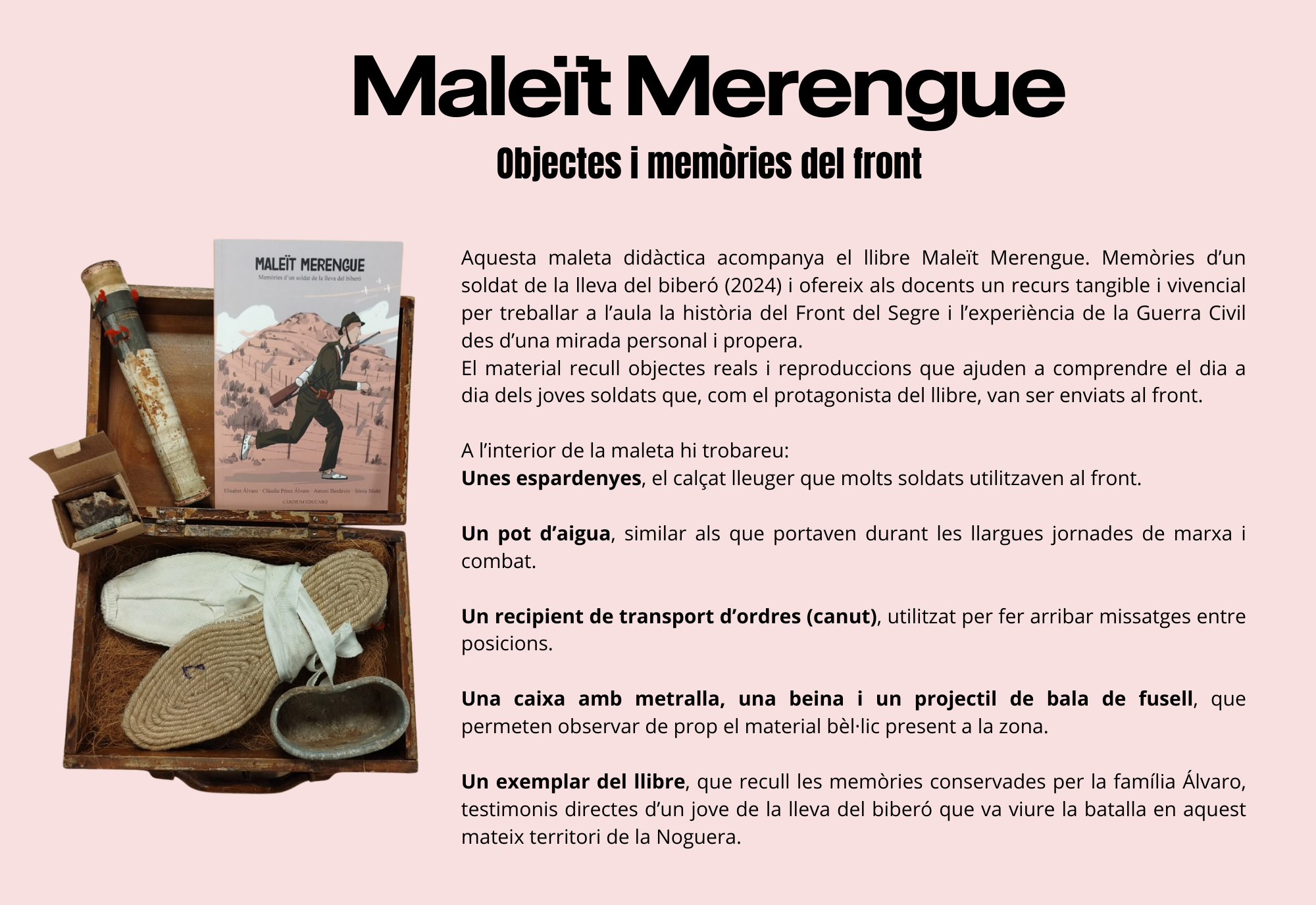 Des del Centre de Recursos hem creat un nou material pedagògic pensat per ajudar els centres educatius a treballar a l’aula la memòria històrica i el patrimoni del nostre territori. Es tracta de la maleta didàctica Maleït Merengue; objectes i memòries del front, un recurs que acompanya el llibre Maleït Merengue. Memòries d’un soldat de la lleva del biberó (2024), un testimoni real i colpidor d’un jove soldat que va viure en primera persona els combats al Front del Segre, a la comarca de la Noguera.