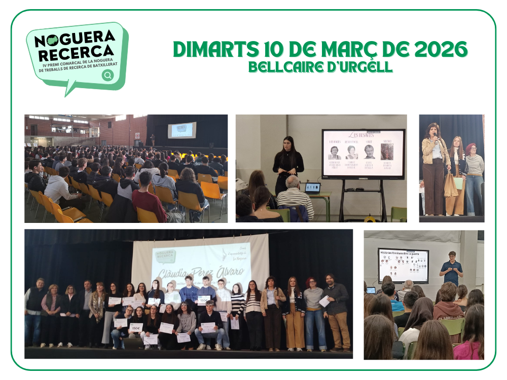 El pavelló poliesportiu de Bellcaire d’Urgell va acolli ahir dimarts 10 de març les presentacions dels treballs participants en la quarta edició del Premi Comarcal de la Noguera de Treballs de Recerca de Batxillerat, una iniciativa per fomentar l’esperit investigador i el rigor acadèmic entre l’alumnat. L’activitat ha estat pensada especialment per als estudiants de […]