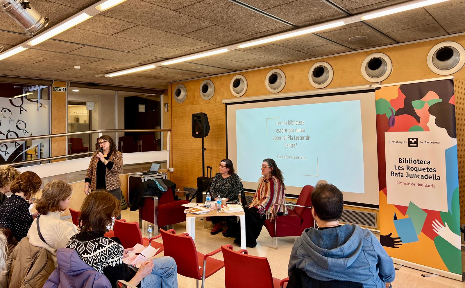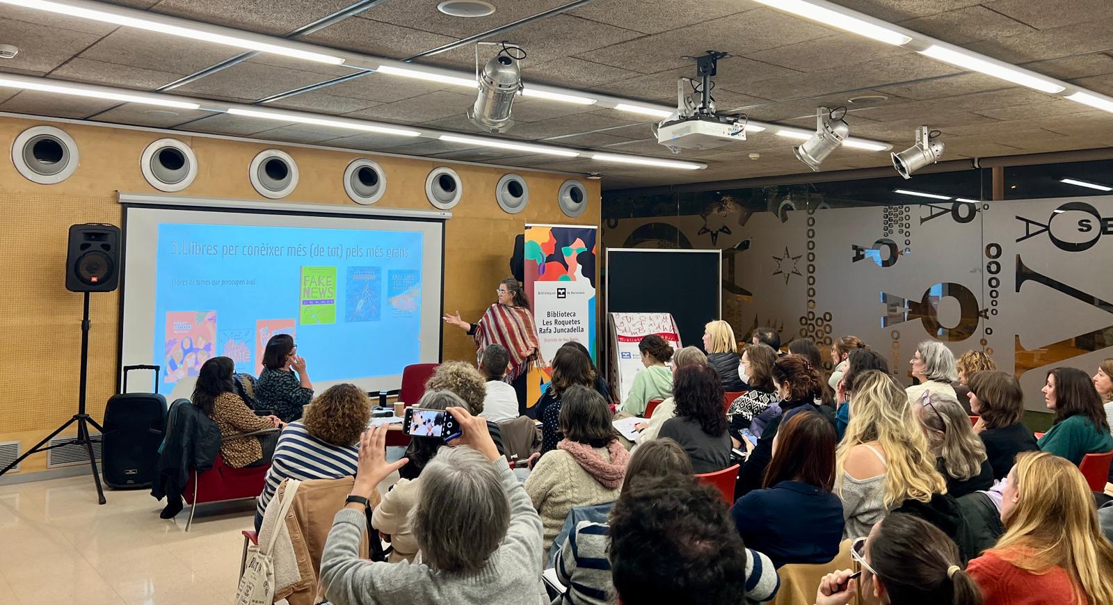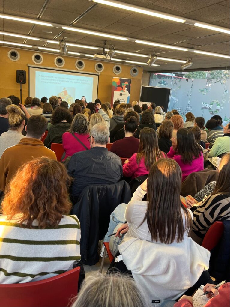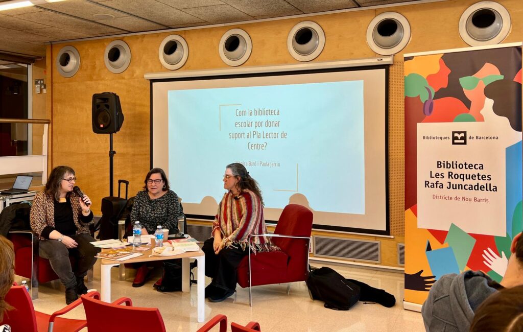 Dimarts 11 de febrer a la Biblioteca Les Roquetes-Rafa Juncadella va tenir lloc la jornada anual conjunta dels seminaris de biblioteques de la ciutat i organitzada pels CRP’s de Barcelona. Enguany la jornada va comptar amb la participació de la Paula Jarrin i de la Mònica Baró i hi van assistir al voltant d’un centenar de docents. La sessió es va centrar en “Com des de la biblioteca escolar es pot donar suport al Pla Lector” i “Quin ha de ser l’encaix, el paper de la biblioteca escolar dins l’organització de centre?” A la segona part de la sessió es van donar idees, estratègies per a poder anar configurant recorreguts lectors amb la intenció de crear identitats lectores.