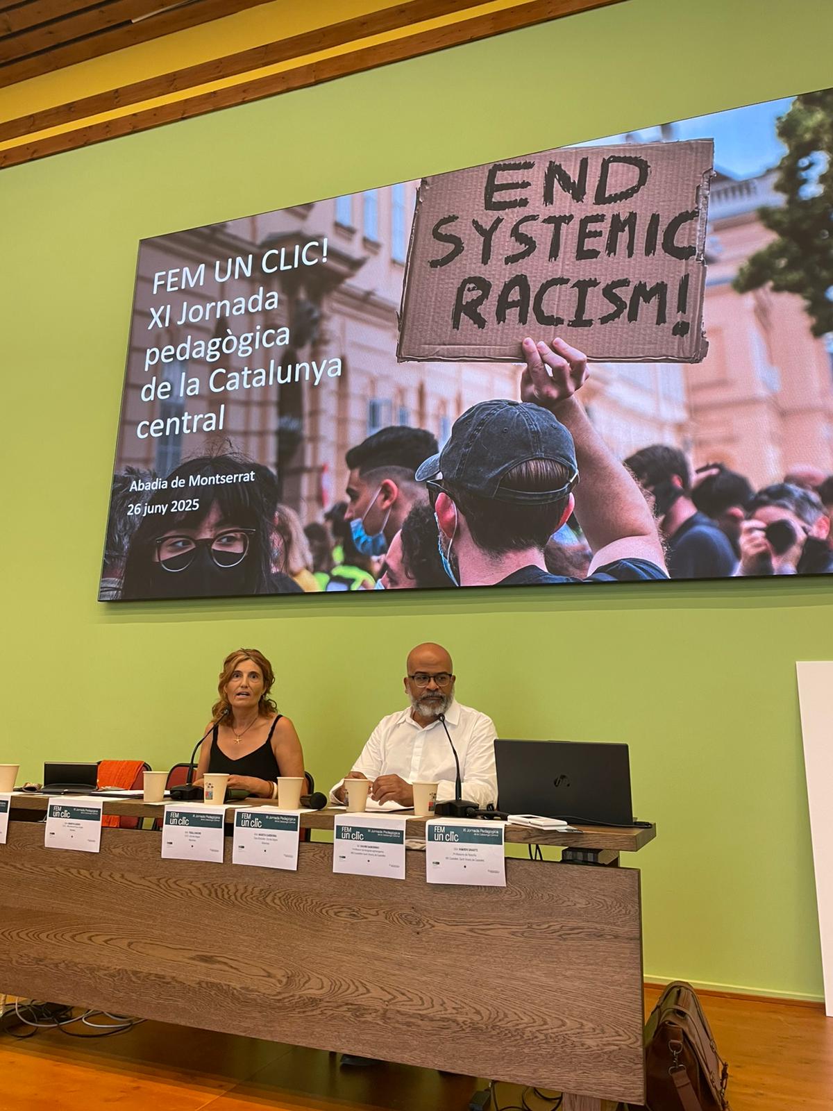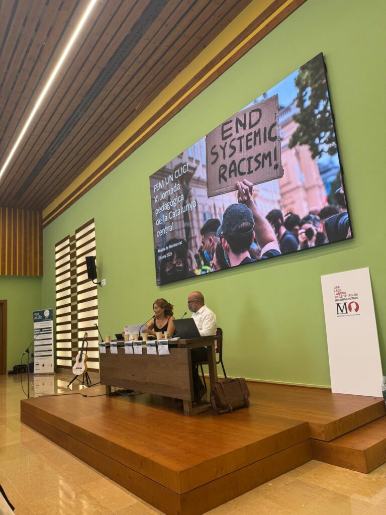 Després de la taula rodona, vam comptar amb la intervenció de Miquel Àngel Essomba, catedràtic de pedagogia de la UAB. Des de la seva perspectiva, ens trobem en un moment clau per repensar el futur: “cal tenir una òptica antiracista i decolonial”. Essomba va proposar plantejar-nos algunes preguntes per fer front a l’imaginari d’odi i de racisme que es crea a les xarxes socials: com ensenyem història a les escoles? Com fomentem el pensament crític? Com provoquem empatia…? El conferenciant, expert en interculturalitat, va destacar que hi ha paraules sagrades que “han quedat segrestades”, com ara llibertat o igualtat. Cal dotar-les, de nou, del sentit real.