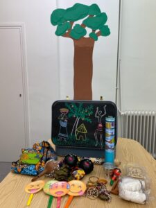 La maleta consta de tot un seguit de material (conte, titelles, instruments, robes, imatges, cançons…) i d’una proposta pedagògica per treballar, sobretot amb alumnes de Primària, aspectes i valors com la solidaritat, l’empatia, el coneixement d’altres cultures i altres realitats, el fenomen de l’emigració…