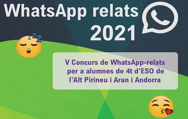 Us convidem a participar en el V Concurs de WhatsApp relats 2021 Alt Pirineu i Aran i Andorra. El concurs fomenta els usos creatius i pedagògics dels mòbils i, des de les noves tecnologies afavoreix la llengua i la literatura catalana i aranesa.
