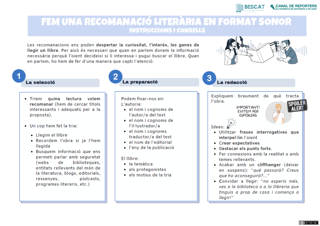 Aquesta activitat consisteix a enregistrar recomanacions de llibres en format àudio. Escoltar una veu que ens parla d’un llibre amb passió pot ser el que ens cal per voler descobrir aquella història. El repte és donar la informació clau: títol, autor/a, per què ens ha agradat, a qui el recomanaríem… tot amb un to que enganxi!