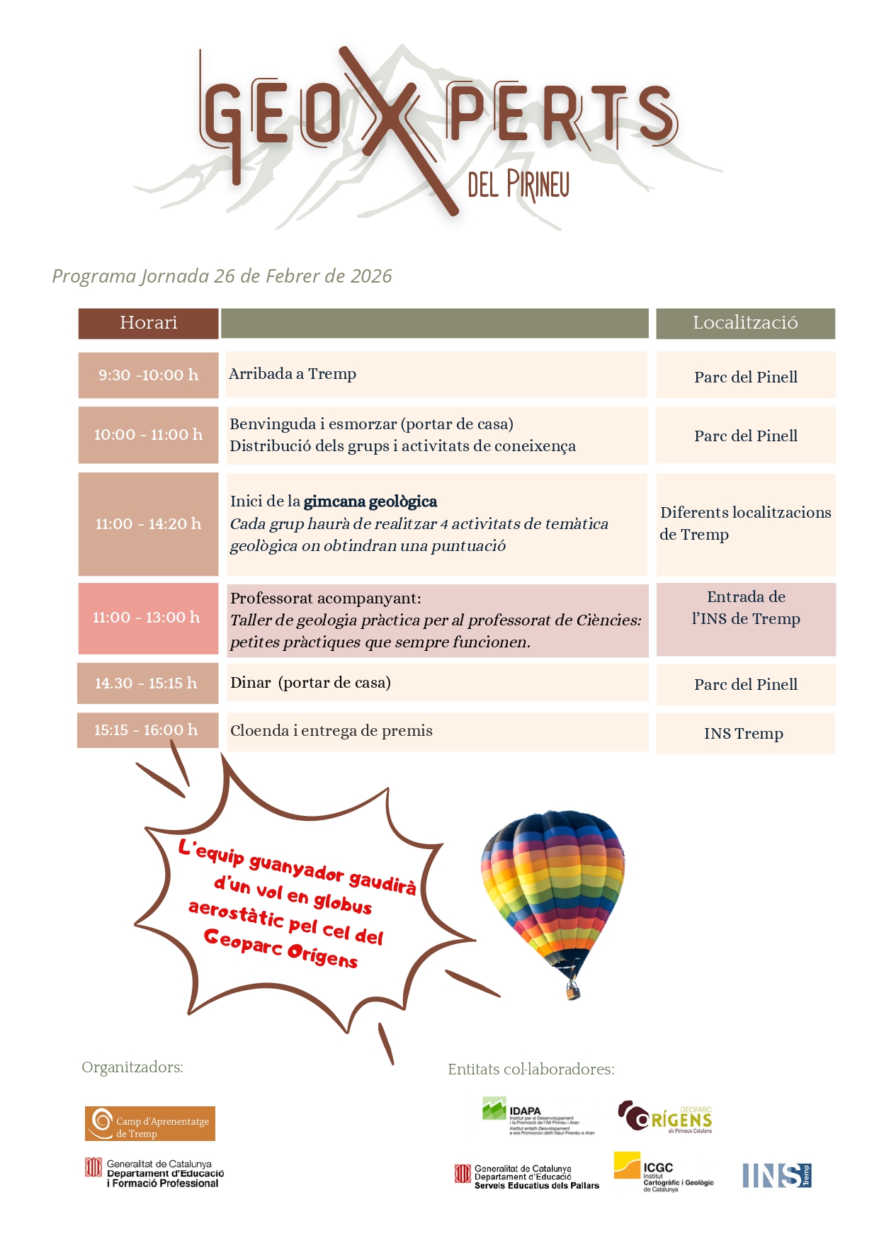 Per si no ho coneixeu,GeoXperts del Pirineu és una trobada dirigida a tot l’alumnat de 4t d’ESO de l’Alt Pirineu i Aran que cursen la matèria optativa de Biologia i Geologia. Amb la geologia com a fil conductor, l’alumnat treballa en petits grups per a resoldre reptes a diferents emplaçaments de la ciutat de Tremp. Els i les noies competeixen amb grups de 12, formats per alumnes de 4 centres educatius diferents (3 alumnes de cada centre). En cada una d’aquestes activitats obtenen una puntuació que els permetrà competir per al premi final: un vol amb globus pel Geoparc OrÃgens.
