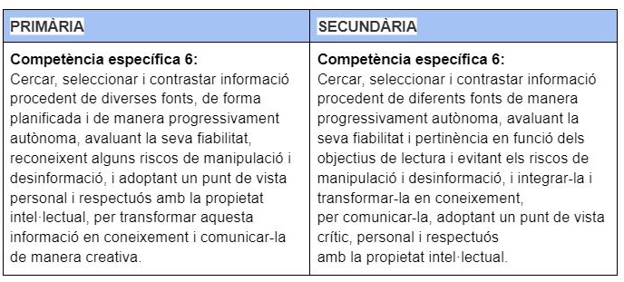 En els currículums d’ensenyaments bàsics la competència específica 6 dins de l’àrea de llengua catalana, aranès i llengua castellana està dedicada a la cerca de la informació i s’hi destaca el paper de la biblioteca escolar: