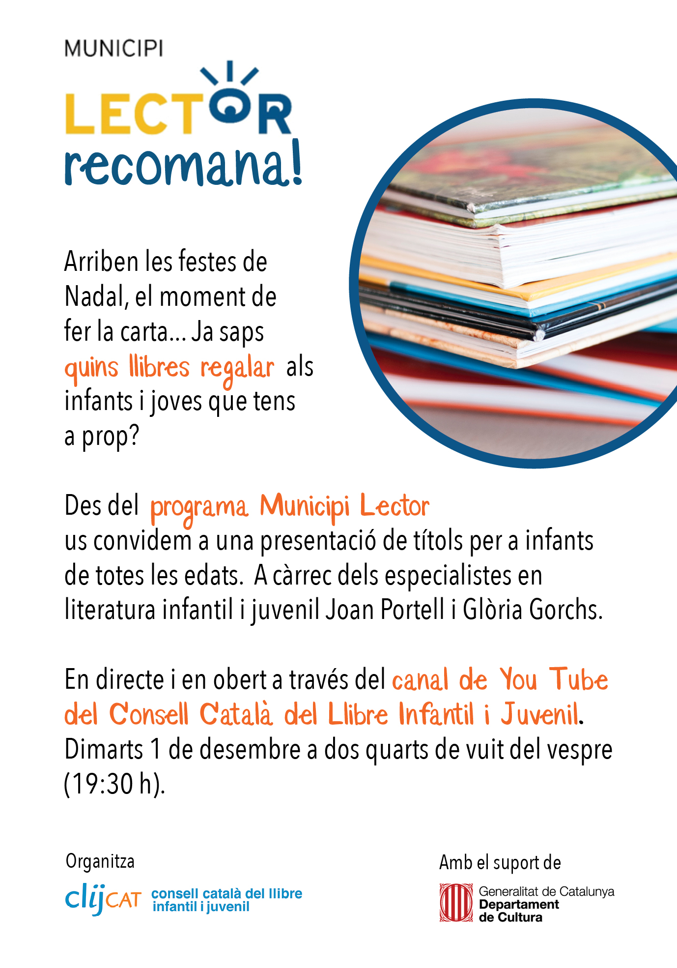 Si regaleu llibres per Nadal i voleu saber què pot interessar als infants i joves, us pot interessar de seguir les recomanacions del Consell Català del Llibre Infantil i Juvenil , a càrrec de Joan Portell i  Glòria Gorchs pel canal de Youtube del CLIJCAT. La presentació serà el dimarts 1 de desembre a les 19.30h.