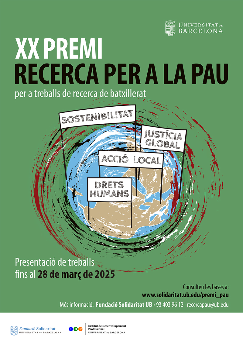 La Fundació Solidaritat de la Universitat de Barcelona, amb l’objectiu de promoure l’educació per a la pau en totes les modalitats del batxillerat i d’enfortir la cultura de pau des de la recerca, convoca la vintena edició del Premi de Recerca per a la Pau per a treballs de recerca d’estudiants de batxillerat.