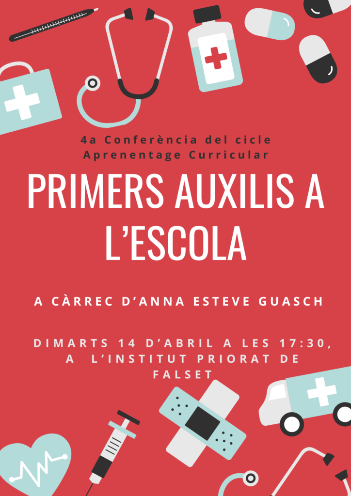 Conferència: Primes auxilis a l’escola Feu un comentari / Per admin / 10/04/2026 / General Portada Ja tenim apunt la 4a conferència del cicle Aprenentatge curricular : Primers auxilis a l’escola. Aquesta es realitzarà a l’Institut Priorat de Falset, el proper dimarts 14 d’abril de 2026. Serà a càrrec de l’Anna Esteve Guasch. Us hi esperem!