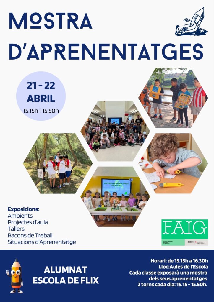 L’escola Enric Grau i Fontseré de Flix presenta dimarts 21 i dimecres 22 abril la Mostra d’Aprenentatges 2026 en format exposició a l’escola. Cada classe realitzarà una exposició de projectes, treballs, investigacions i activitats d’aula en dos torns cada dia: el primer a les 15.15h i el segon a les 15.50h.