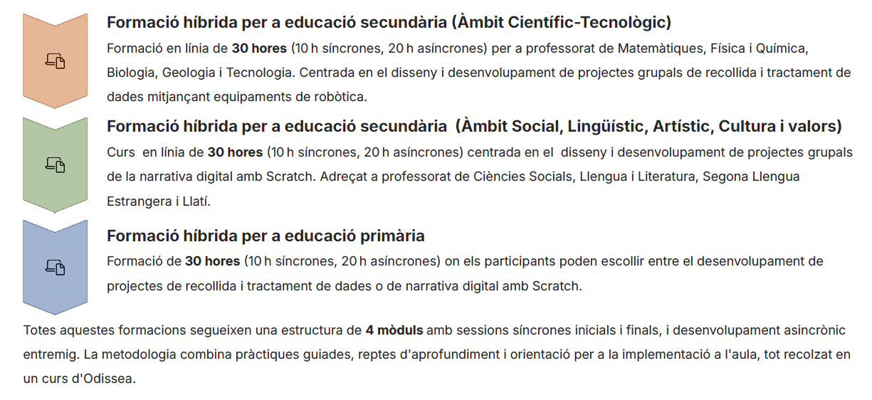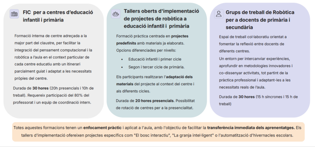 Formació en PC i Robòtica: Amb l’objectiu de facilitar la implementació del pensament computacional i la robòtica als centres educatius, es proposen diverses modalitats de formació adaptades a diferents nivells i necessitats. Aquesta proposta diferencia entre les accions dissenyades per ser impulsades des delsCentres de Recursos Pedagògics CRP) i per l’Àrea de Cultura Digital. Les modalitats formatives estan dissenyades per proporcionar recursos i estratègies, tot adaptant-se a les necessitats específiques dels diferents nivells educatius, des d’infantil fins a secundària, amb l’objectiu d’integrar aquestes competències de manera transversal al currículum.