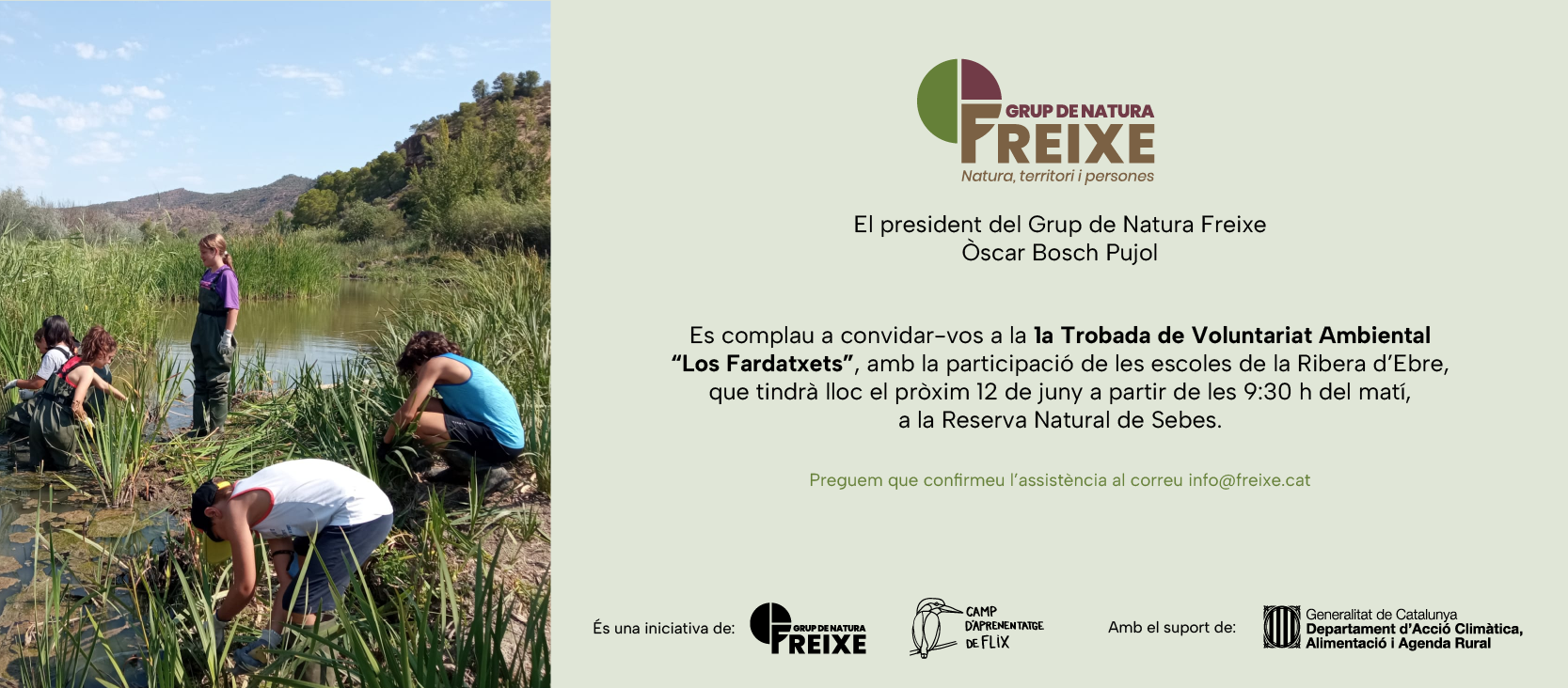 La Junta del Grup de Natura Freixe organitza la 1a Trobada de Voluntariat Ambiental “Los Fardatxets” que tindrà lloc el dimecres 12 de juny a la Reserva Natural de Sabes, a Flix (Ribera d’Ebre, Tarrgona).