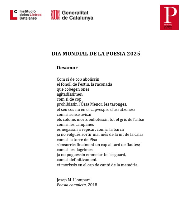En la divuitena edició del DMP, la ILC ha escollit el poema “Desamor” de Josep M. Llompart, de qui enguany commemorem el centenari del naixement.