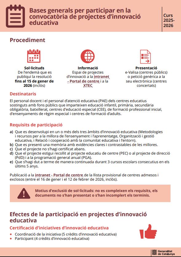 Data final termini presentació sol·licituds de projectes d’innovació educativa: 15 gener de 2026