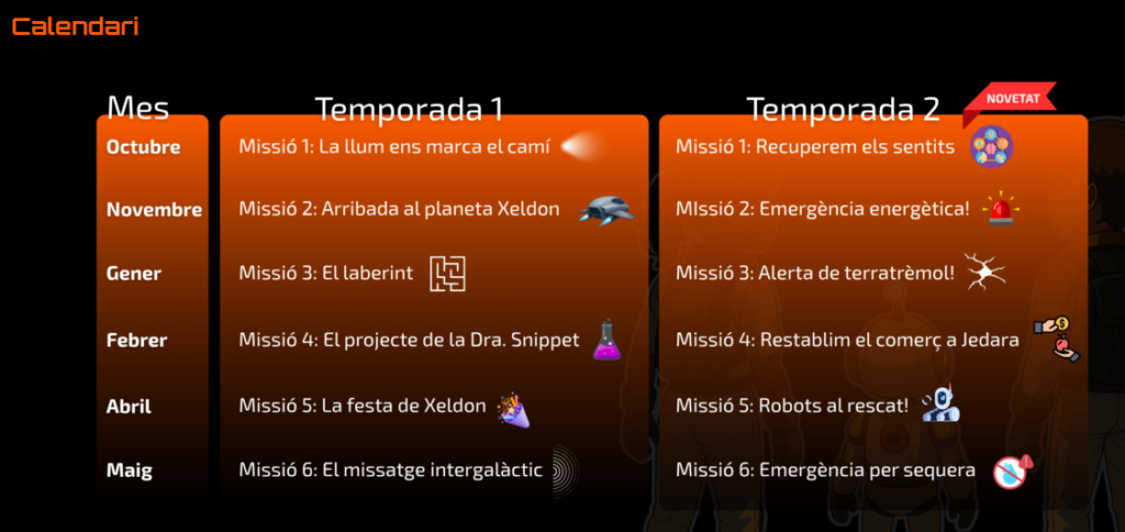 - En què consisteix? Dues temporades que componen 6 reptes o missions que l’alumnat haurà de superar amb l’ajuda dels robots disponibles al centre educatiu.