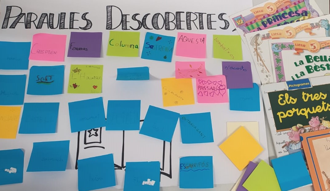 La pràctica parteix dels apadrinaments lectors i s’emmarca en un temps de cercle d’aprenentatge. Així, els alumnes de 1r van anotant en post-it els nous mots que descobreixen durant les lectures i, a continuació, els enganxen en una cartolina. Després, en el transcurs d’una dinàmica de temps de cercle d’aprenentatge, en pregunten els significats i els incorporen en frases que comparteixen oralment amb la resta de companys.