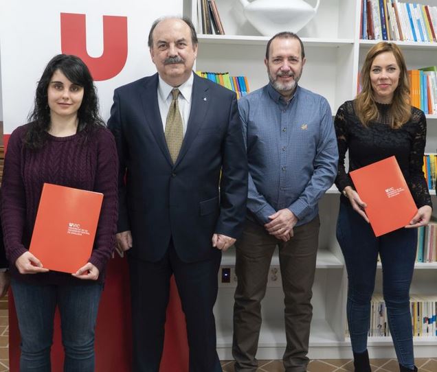 Aquest 28 de febrer ha tingut lloc al Rectorat de la UVic-UCC l’entrega de lliurament de la Beca a l’Excel·lència Universitària “Comtal Vila de Ripoll”, a l’estudiant d’Infermeria Lorena Nájera, i la de Mestre en Educació Primària Judit Subirana. L’acte ha comptat amb la presència del rector, Josep Eladi Baños, del 2n tinent d’alcalde de l’Ajuntament de Ripoll, Josep M. Creixans, i de les coordinadores dels dos graus de les estudiants becades, Eva Rovira i Anna Vallbona.