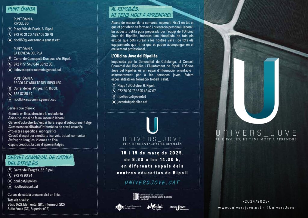 L’Univers Jove es desenvoluparà en diferents espais dels centres educatius de Ripoll, on s’oferiran xerrades, tallers i espais d’orientació personalitzada. L’esdeveniment permetrà als i les assistents interactuar amb professionals de diferents à mbits, aixà com amb representants dels centres educatius i de formació de la comarca.