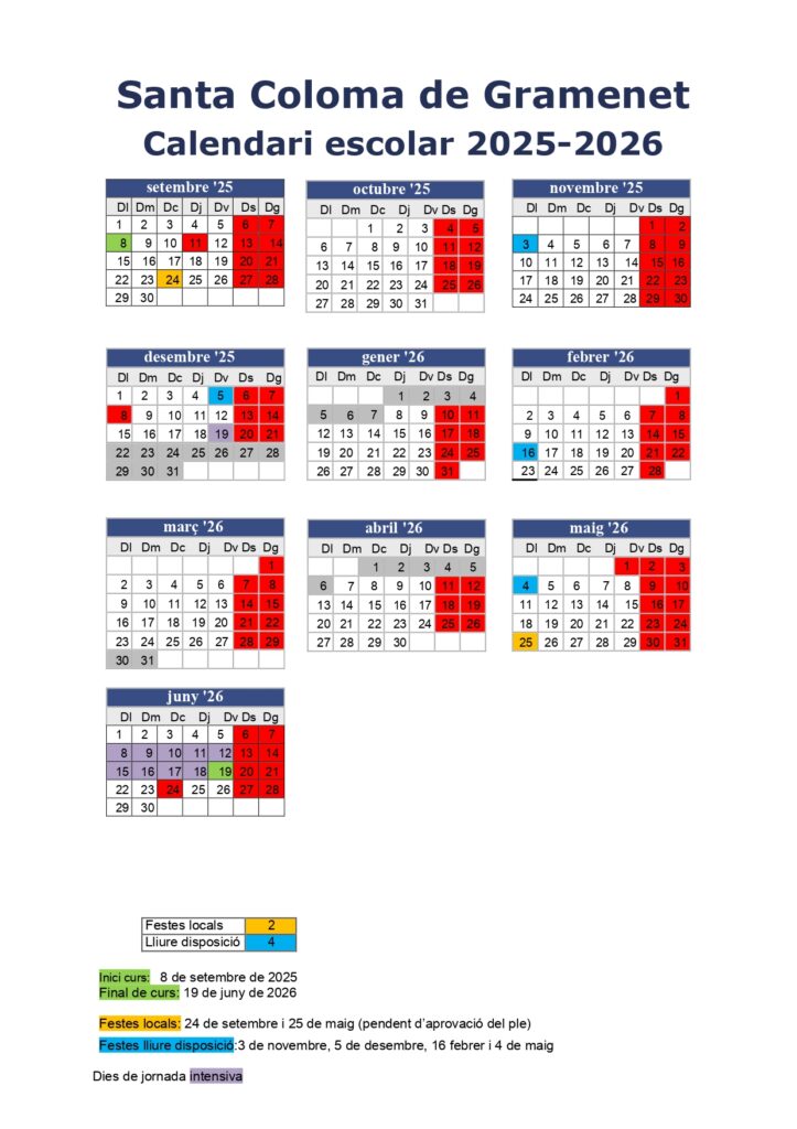 El nostre servei educatiu romandrà tancat al públic, a més a més dels períodes de vacances escolars (del 22 de desembre de 2025 al 7 de gener de 2026 i del 30 de març de 2026 al 6 d’abril de 2025) i dels dies de festes laborals oficials a Catalunya, els següents dies de festa local i de lliure disposició, acordats pel Consell Escolar Municipal de Santa Coloma de Gramenet (Podeu consultar també el calendari en format PDF):