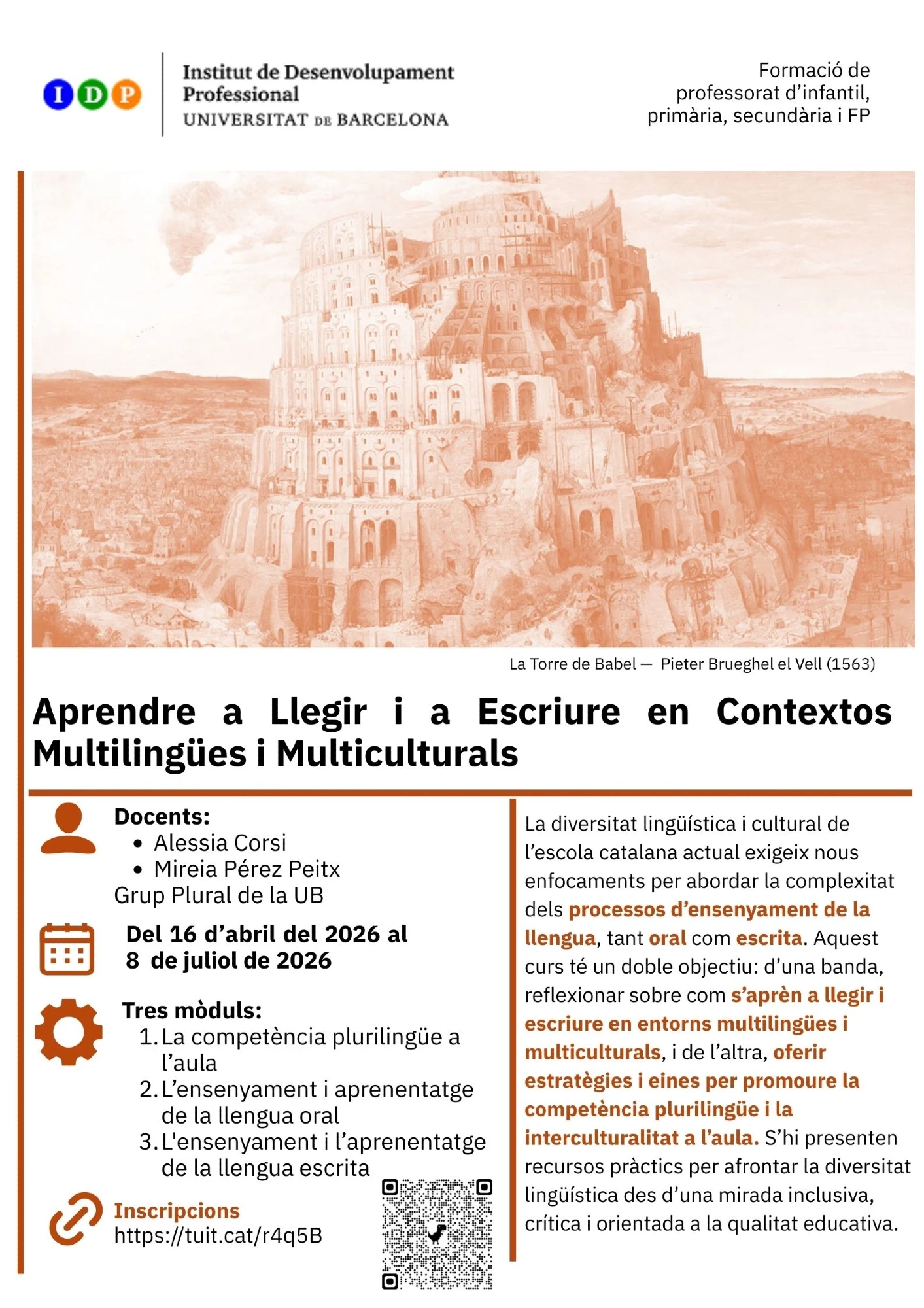 Formació sobre lectura i escriptura en contextos multilingües. Una formació per repensar l’ensenyament de la llengua des d’una mirada plurilingüe i inclusiva.