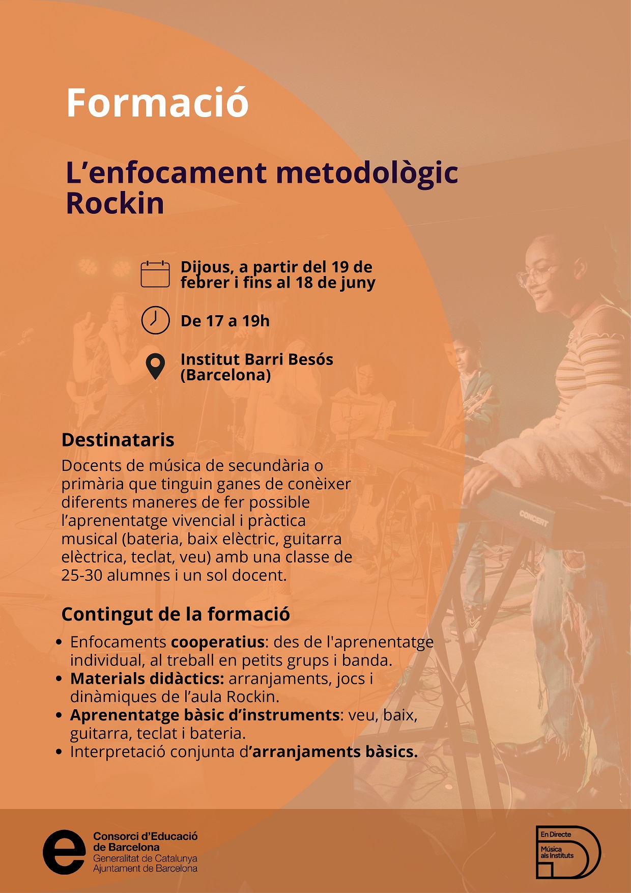 Us fem recordatori de la formació En Directe. Música als instituts amb enfocament metodològic Rockin està per docents de música i de totes les modalitats. Cada dijous de 17h a 19h a l’Institut Barri Besòs de Barcelona.
