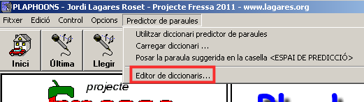 - Obrir el programa Plaphoons, no obrir ni crear cap plafó (tancar la finestra inicial emergent) i escollir el menú Predictor de paraules | Editor de diccionaris…