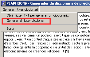 - Tant en un cas com en l’altre, després d’enganxar el text a la finestra de l’esquerra de l’editor de diccionaris de Plaphoons, escollim el menú Generar fitxer de diccionari | Generar el fitxer de diccionari . Llavors a la finestra de la dreta de l’editor en apareixerà la llista de paraules extretes del text.