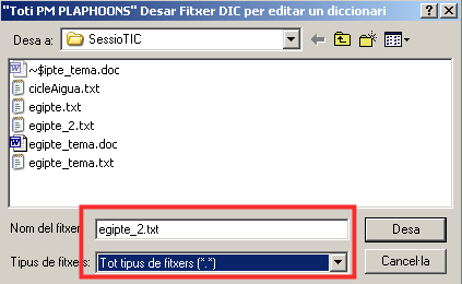- A la finestra emergent per a guardar el fitxer, naveguem per cercar la carpeta on ens interessa guardar el fitxer, escollim Tots els tipus de fitxer i posem el nom que vulguem seguit de l’extensió . txt