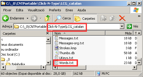 - Descomprimim el fitxer Click-N-Type.zip i ens crearà una carpeta. Localitzem, dins la carpeta Click-N-Type | LCG_catalan, el fitxer Words.txt (que és un fitxer diccionari per a la configuració català del programa). Canviarem el nom d’aquest fitxer (per ex.: Words-catala.txt), i copiarem el fitxer diccionari que volem que utilitzi l’alumne a dins de la mateixa carpeta i li canviarem el nom per Words.txt.