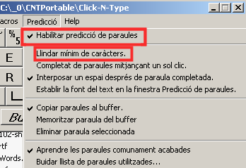 - Habilitem l’ús de la predicció al menú Predicció | Habilitar predicció de paraules . També poden variar el llindar de predicció, és a dir, a partir de quantes lletres apareixeran les paraules de predicció.