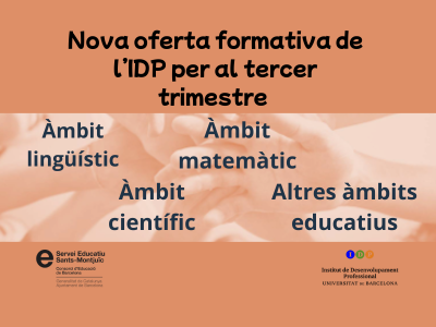Ja està disponible la nova oferta formativa de l’IDP-UB per al tercer trimestre, adreçada al professorat d’infantil, primària, secundària i FP. Es tracta d’una proposta gratuïta i pràctica que inclou formacions destacades en llengua i matemàtiques, així com cursos de ciències i altres àmbits educatius. Les activitats, majoritàriament semipresencials, ofereixen eines aplicables a l’aula i responen als reptes actuals de l’educació. Consulteu el pòster per conèixer tots els cursos i accedir als enllaços d’inscripció.