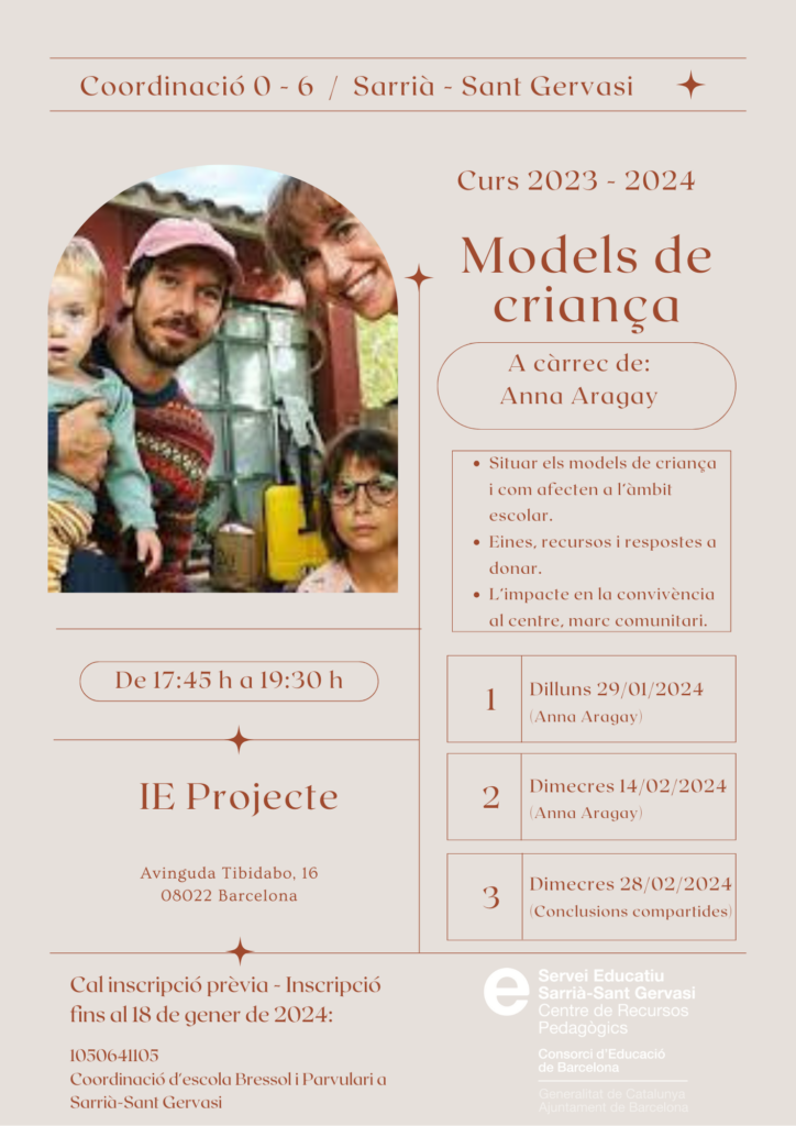 Un nou curs, des el CRP Sarrià-Sant Gervasi i en el marc del Seminari de Coordinació 0-6 organitza unes jornades vinculades amb una temàtica acordada des de la Xarxa de Centres Públics 0-18 de la zona. Aquest curs, el fil conductor serà els Models de criança. Es realitzaran tres sessions. Les dues primeres sessions aniran a càrrec de l’Anna Aragay