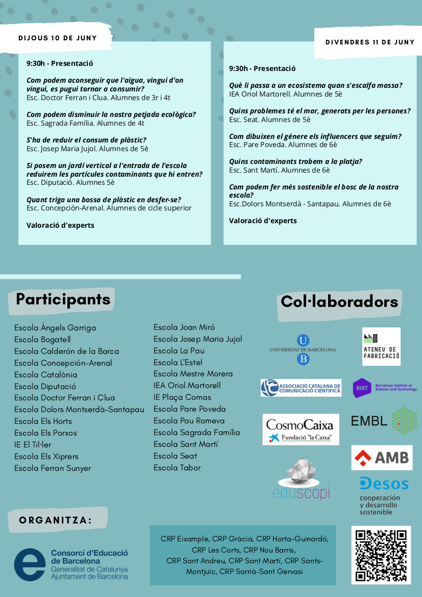 Ens plau convidar-vos al 8è congrés del Congres de ciència de Barcelona, que té com objectiu el foment de la ciència i la investigació a primària, i que enguany tindrà lloc els propers dies 7, 8, 9, 10 i 11 de juny.