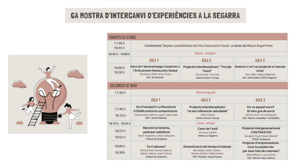 Els dies 29 d’abril i 5 de maig, la sala d’actes i les aules de l’Institut Antoni Torroja, ubicades a l’emblemàtic edifici de la Universitat de Cervera, van acollir la 6a edició de la Mostra d’Intercanvi d’Experiències Educatives de la Segarra.