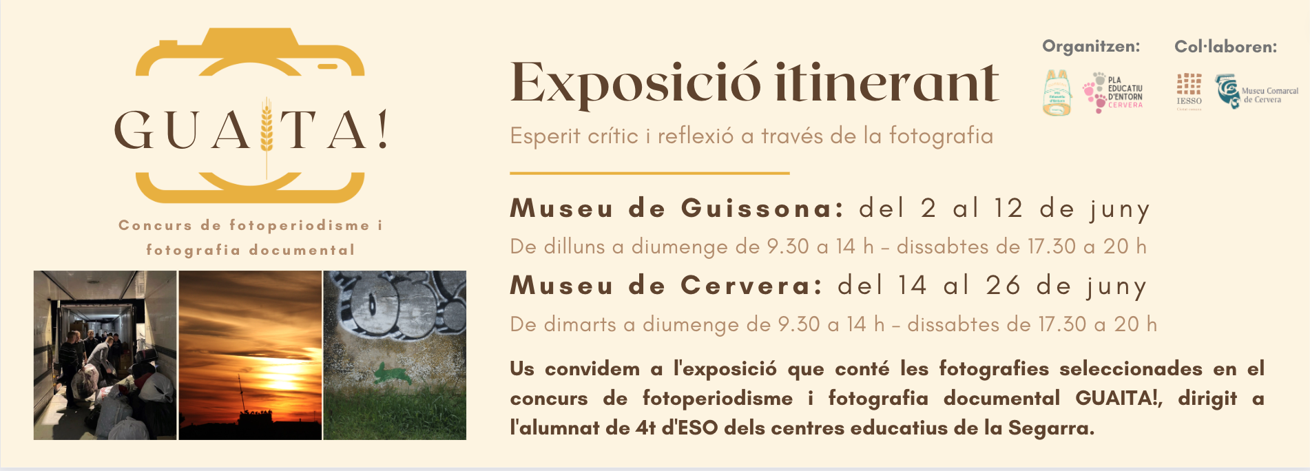 A partir del dia 2 de juny es podran veure les fotografies seleccionades en el concurs de fotoperiodisme i fotografia documental GUAITA!, dirigit a l’alumnat de 4t d’ESO dels instituts de la Segarra.
