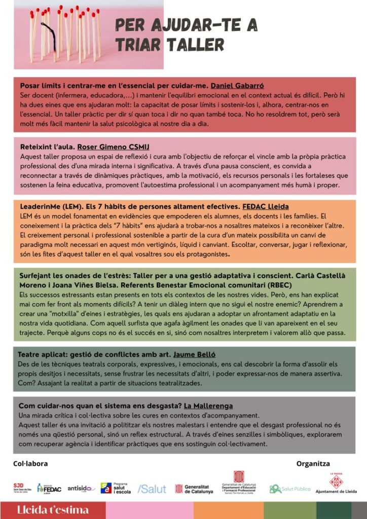 2a Jornada Planifica Salut: Des d’on acompanyem quan ens descuidem? admin0516/09/25 Activitat del Pla de Formació de Zona del Segrià Inscripció gratuïta aquí Descarrega el programa complet