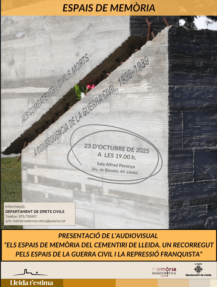 El Departament de Drets Civils de l’Ajuntament de Lleida té l’honor de convidar-vos a l’acte de presentació de l’audiovisual “Els Espais de Memòria del Cementiri de Lleida. Un recorregut pels espais de la Guerra Civil i la repressió franquista”, que tindrà lloc el dijous 23 d’octubre de 2025 a la sala Alfred Perenya (avinguda de Blondel, 64) a partir de les 19.00.