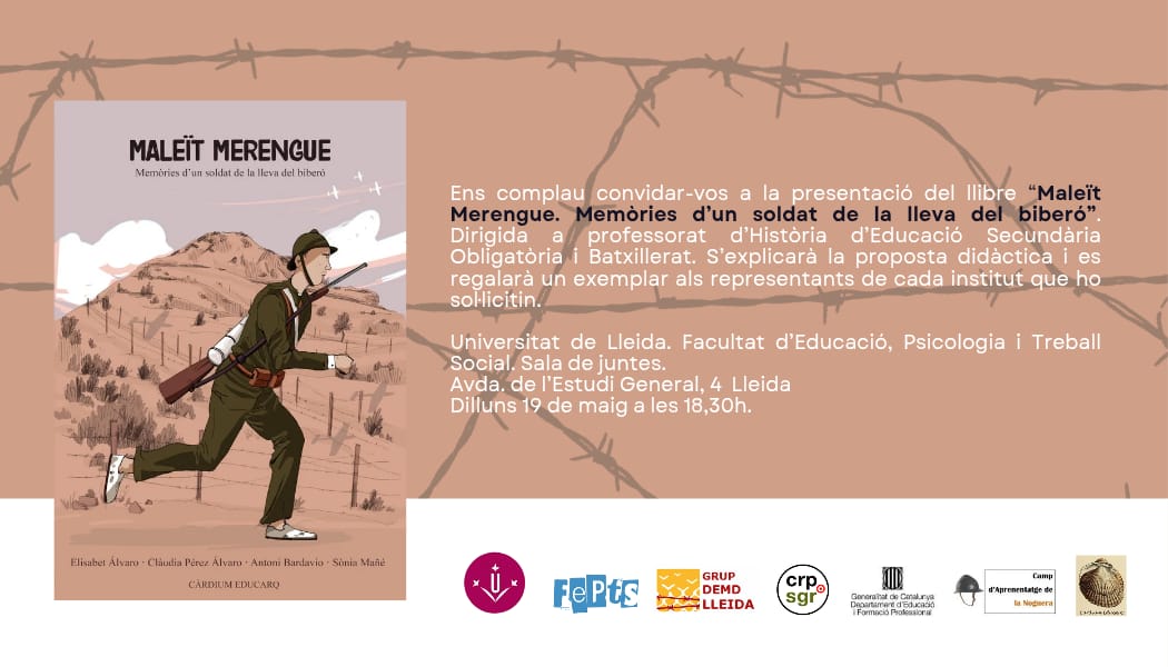 Presentació oberta a tota la comunitat docent de Lleida, especialment al professorat de Ciències Socials de Secundària i Batxillerat, del llibre “Maleït Merengue. Memòries d’un soldat de la lleva del biberó”. Aquest llibre, dirigit especialment a l’alumnat de 16 a 18 anys, està basat en les memòries manuscrites del besavi de la Clàudia Pérez Àlvaro, alumna de l’Institut Ciutat de Balaguer i que, malauradament, ens ha deixat recentment. De fet, la presentació serà un homenatge a la seva persona i al seu treball.