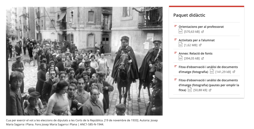 A nivell competencial, les activitats inicials consisteixen en analitzar fotografies i textos, datats entre el 1931 i 1933, juntament amb els posicionaments de diverses figures del període sobre la incorporació del vot femení. L’activitat final se centra en sintetitzar i extreure conclusions sobre la informació tractada a les fonts. Així doncs, podem aprofitar aquest recurs per treballar amb el nostre alumnat com va ser la incorporació del vot femení en aquella societat, quines dificultats va trobar, o, entre d’altres, què va passar amb aquest dret quan s’instaurà el règim franquista.