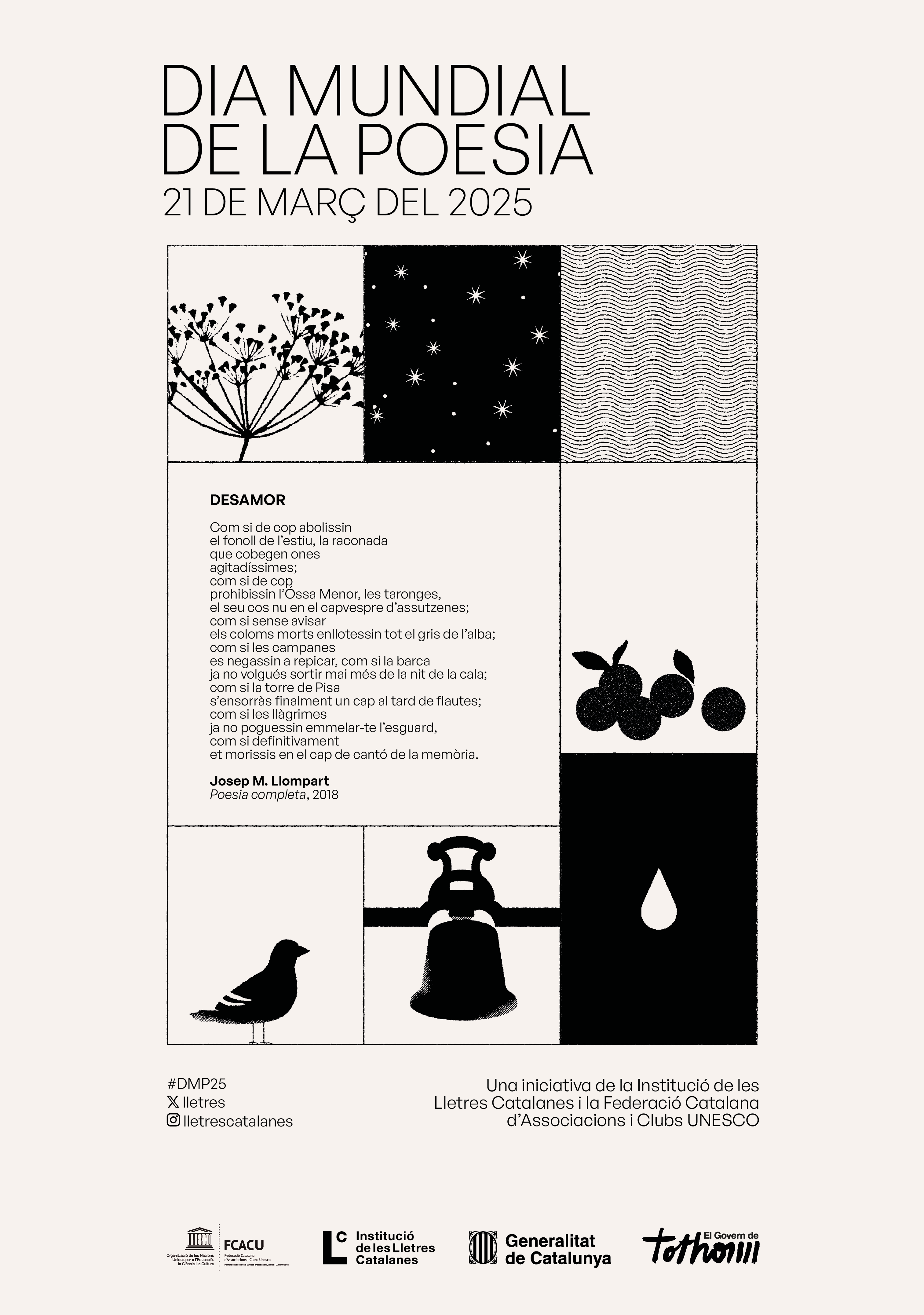 L’any 1999 la Conferència General de la UNESCO va proclamar el 21 de març Dia Mundial de la Poesia (DMP). Per celebrar ho, des de l’any 2008 la Institució de les Lletres Catalanes i la Federació Catalana d’Associacions i Clubs Unesco promocionen aquesta celebració tant en el nostre domini lingüístic com a la resta d’Europa i del món amb l’elecció d’un poeta i un seu poema per a l’ocasió. Partint d’aquesta composició, la ILC elabora un fullet amb l’original en català i la seva traducció a vint-i-tres llengües, que difon àmpliament, promou l’organització d’accions poètiques, presencials i a través de les xarxes, i organitza un acte central el mateix dia 21. En la divuitena edició del DMP, la ILC ha escollit el poema “Desamor” de Josep M. Llompart, de qui enguany commemorem el centenari del naixement.