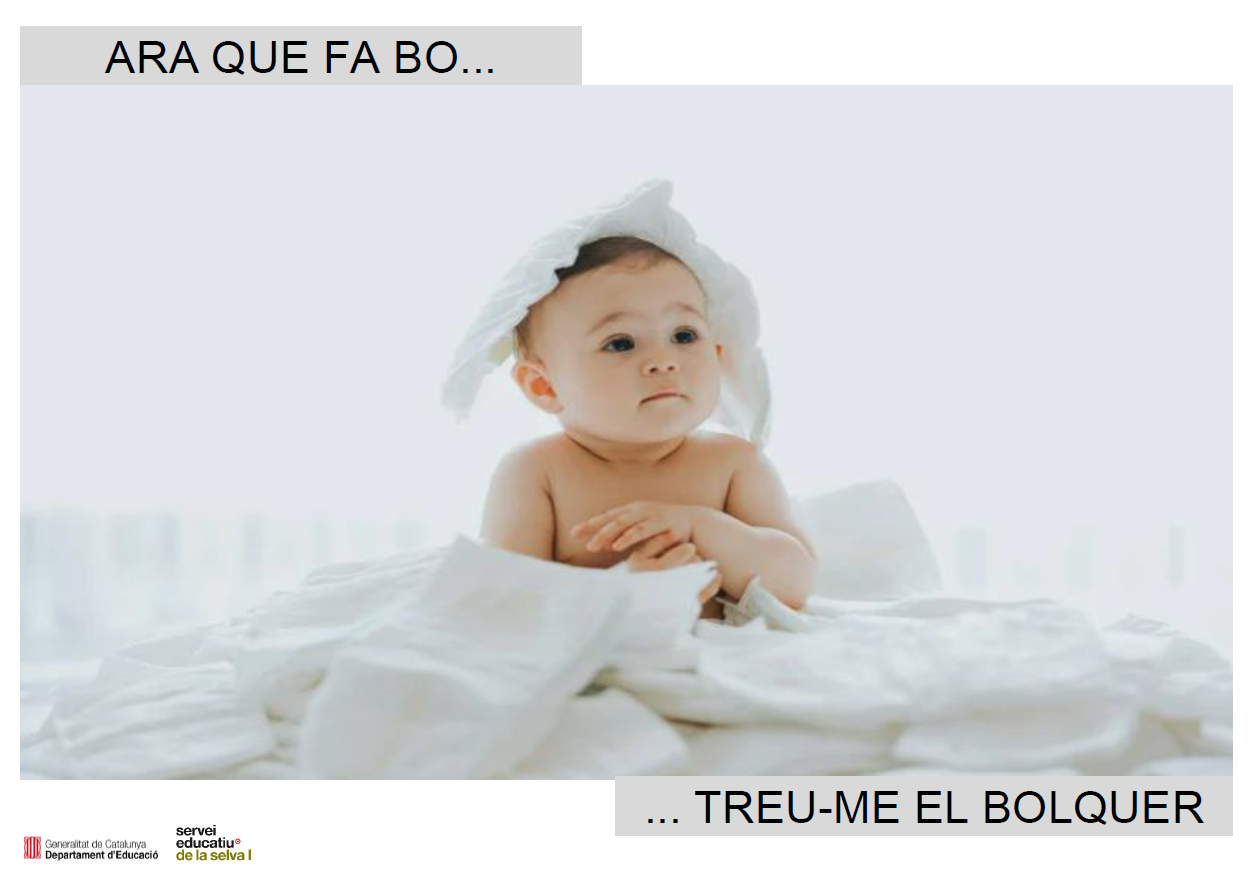 Aquest és el primer eslògan, fruit del treball que van fer el curs passat en el Seminari Intercanvi i0-3. Cada mes apareixerà un eslògan perquè la família el pugui treballar a casa.