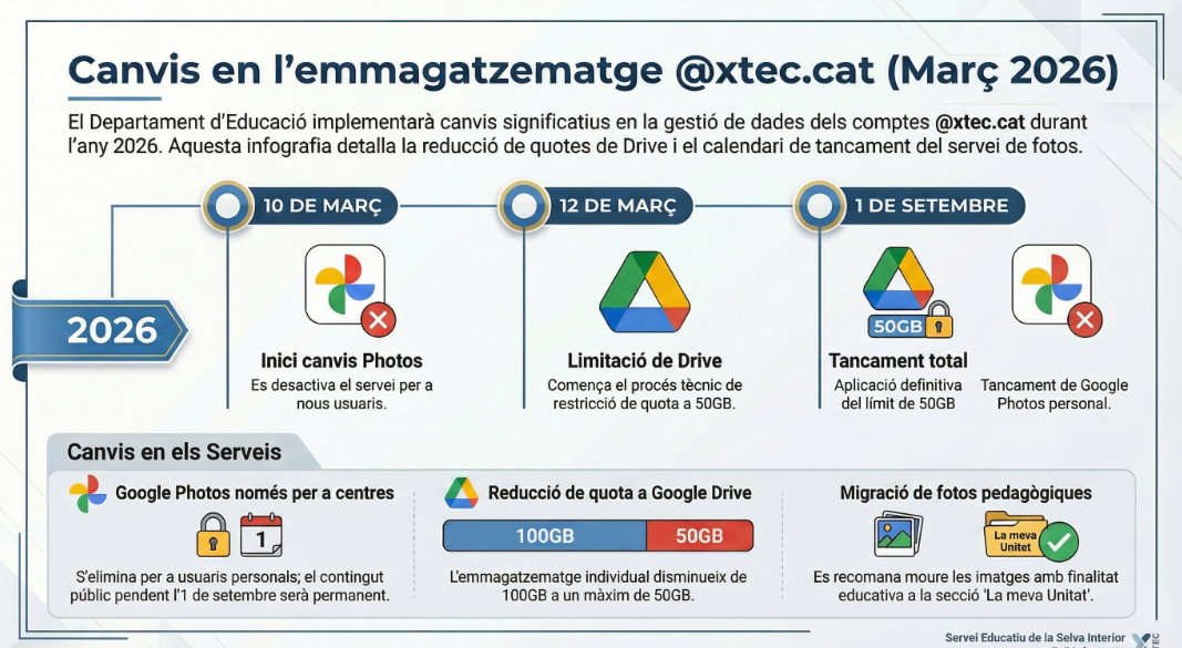 Arran de les noves directrius de Cultura Digital, s’han comunicat canvis significatius en la gestió de l’espai d’emmagatzematge de les eines de Google per als docents. Aquestes mesures s’emmarquen en la necessitat d’optimitzar els recursos, ja que actualment Google Photos ocupa un 20% de l’espai total del domini XTEC.