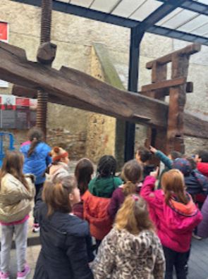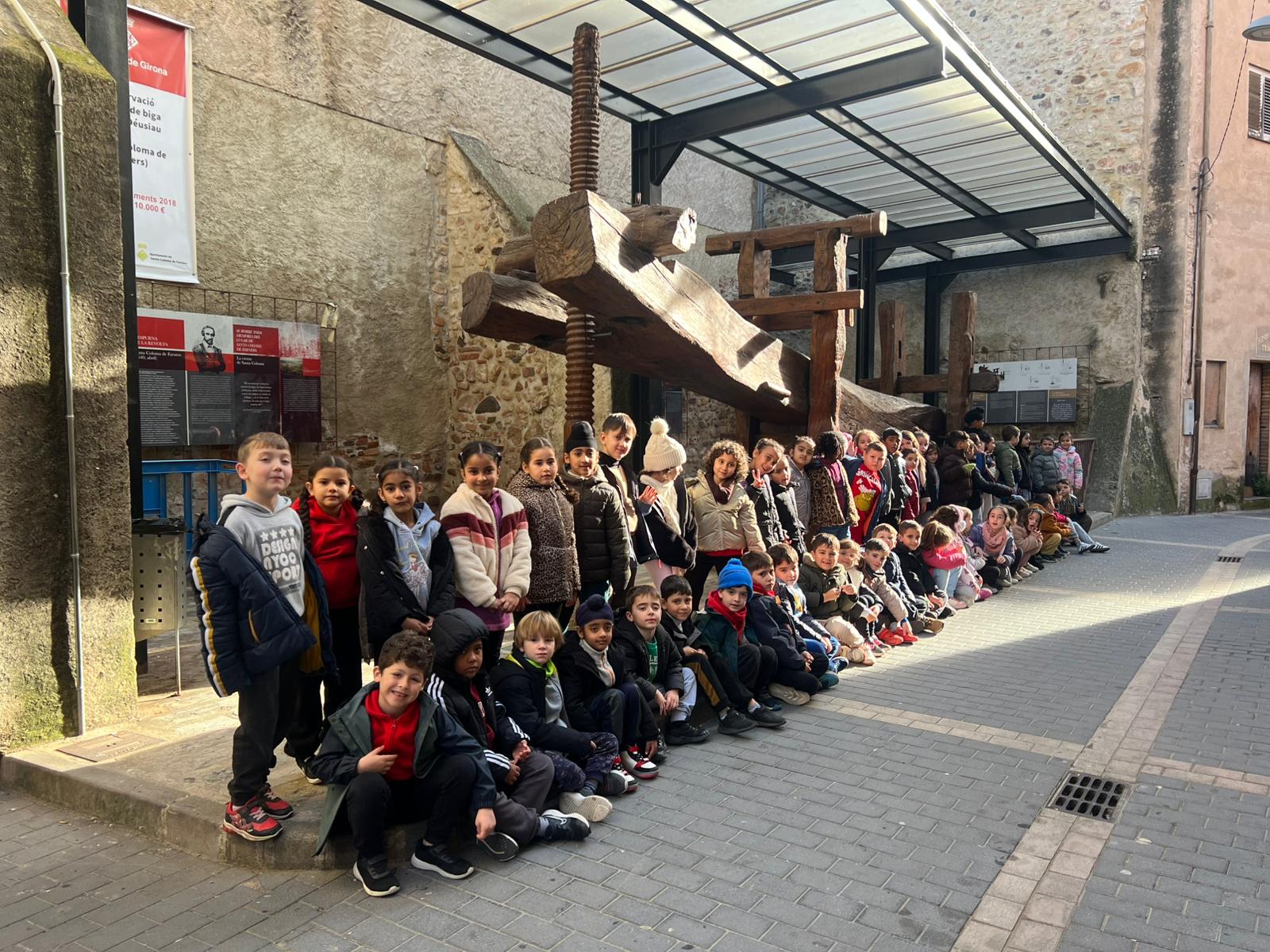 • La visita a la premsa de biga de forca, ubicada en un dels carrers del centre de Santa Coloma de Farners, on els infants van conèixer d’aprop aquest antic mecanisme tradicional de premsar.