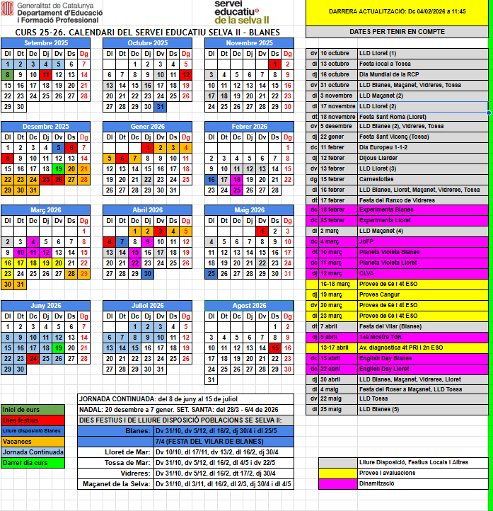 El nostre Servei Educatiu romandrà tancat al públic, a part dels períodes de vacances escolars i dels dies de festes laborals oficials a Catalunya, els següents dies de lliure disposició acordats pel Consell Escolar Municipal de Blanes: