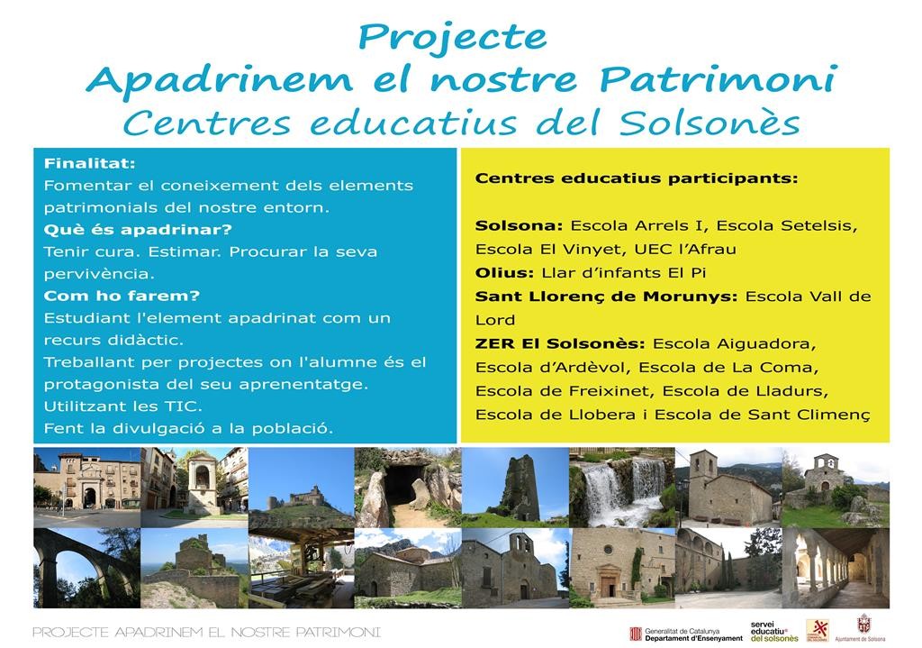 El projecte Apadrinem el nostre patrimoni es basa en la idea de l’adopció d’un element patrimonial per part d’un centre educatiu i que vol fomentar el coneixement dels elements patrimonials de l’entorn amb una actitud participativa de la comunitat escolar. Finalitat: Fomentar el coneixement dels elements patrimonials del nostre entorn. Què és apadrinar? Tenir cura. Estimar.
