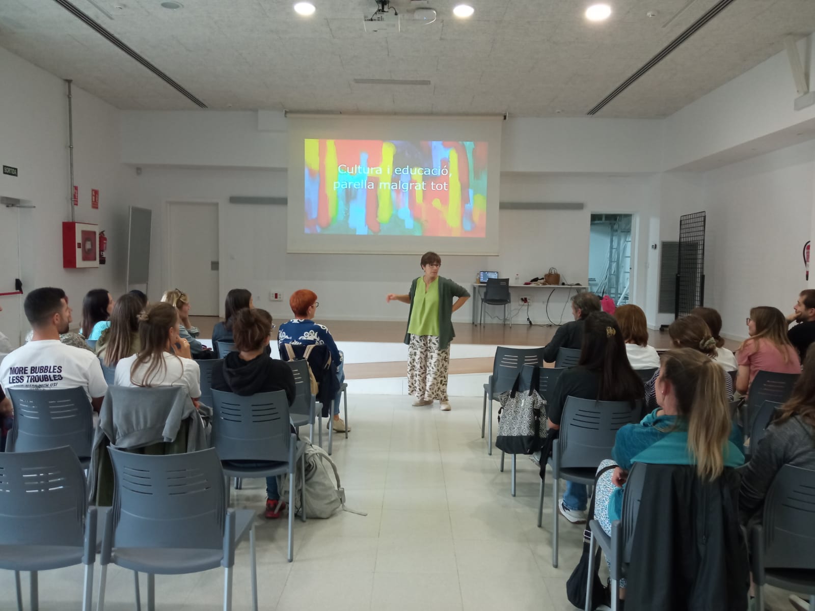 Ester Bonal va captivar el públic assistent a la seva xerrada, que va viure de primera mà l’emoció que pot despertar l’art dins les aules. Directa, franca i planera, la impulsora de l’espai Xamfrà (centre de música i escena per a la inclusió social al barri del Raval) va parlar de la importància de la cultura per aconseguir una inclusió real. A la vegada, va incidir en la necessitat de desenvolupar una consciència crítica entre el nostre alumnat, un objectiu que també necessita de les arts per obrir la ment.