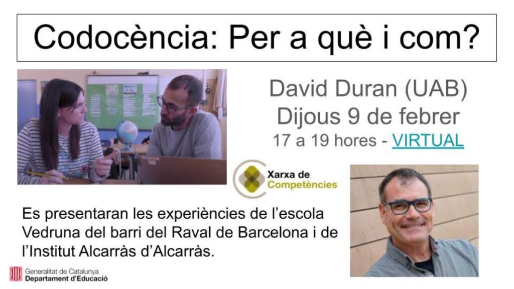 Dijous, 9 de febrer, de 17.00 a 19.00 es farà una sessió virtual, La codocència: per a què i com? Comptarem amb la presència de David Duran (UAB) expert en temes de codocència i coordinador de la recerca sobre observació entre iguals. Tanmateix, també participaran docents i mestres de l’Institut Alcarràs d’Alcarràs i de l’escola […]