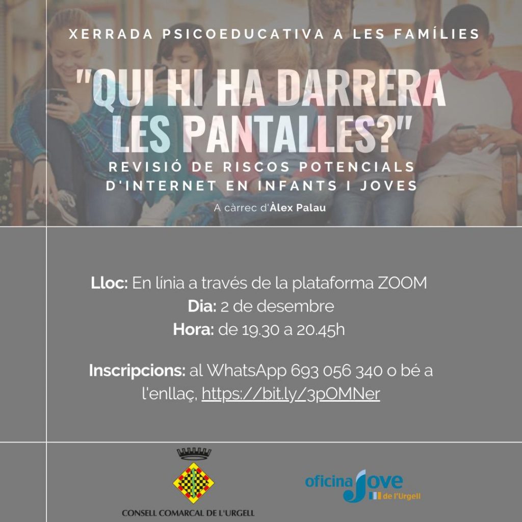El Consell Comarcal de l’Urgell i l’Oficina Jove de l’Urgell han organitzat la conferència “Qui hi ha darrera les pantalles?” adreçada a tota la comunitat educativa de Tàrrega. Els riscos associats a l’ús de telèfons mòbils i altres dispositius d’accés a internet és un dels reptes que hem d’afrontar dia a dia en l’educació dels […]