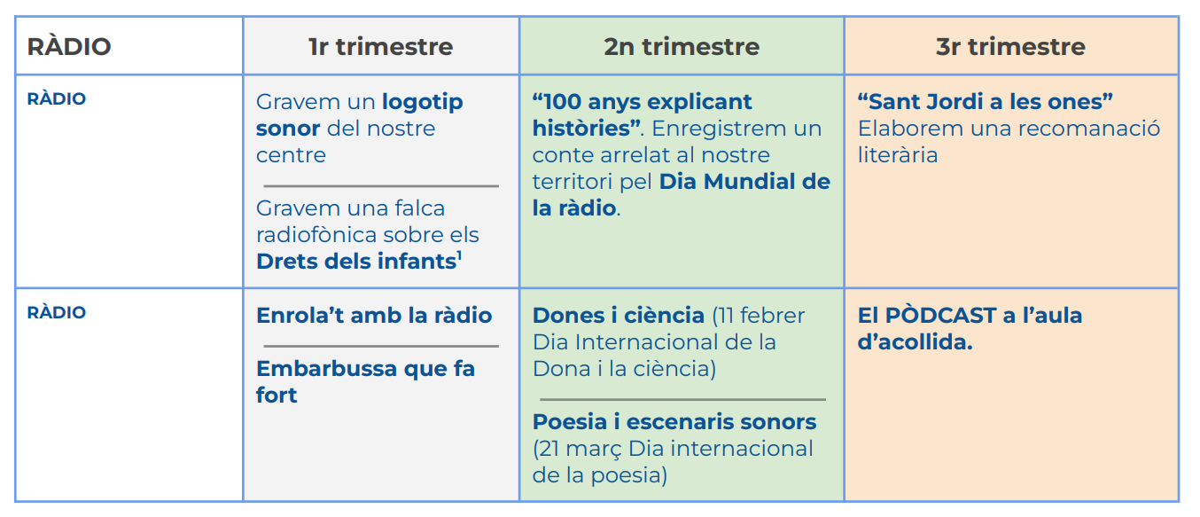 Hem planificat un mínim de dues activitats per trimestre, que inclouen projectes de ràdio i d’audiovisuals. Podeu participar en una, més d’una o a totes les activitats que us proposem, en un mateix nivell o en diversos: