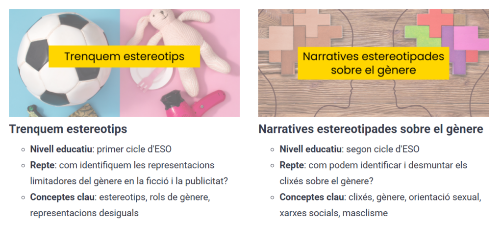Aquestes dues propostes didàctiques posen el focus en l’anàlisi dels mitjans de comunicació, observant la presència/absència de les dones en la informació i en l’imaginari cultural, així com l’ús d’estereotips sexistes.